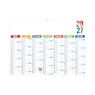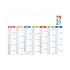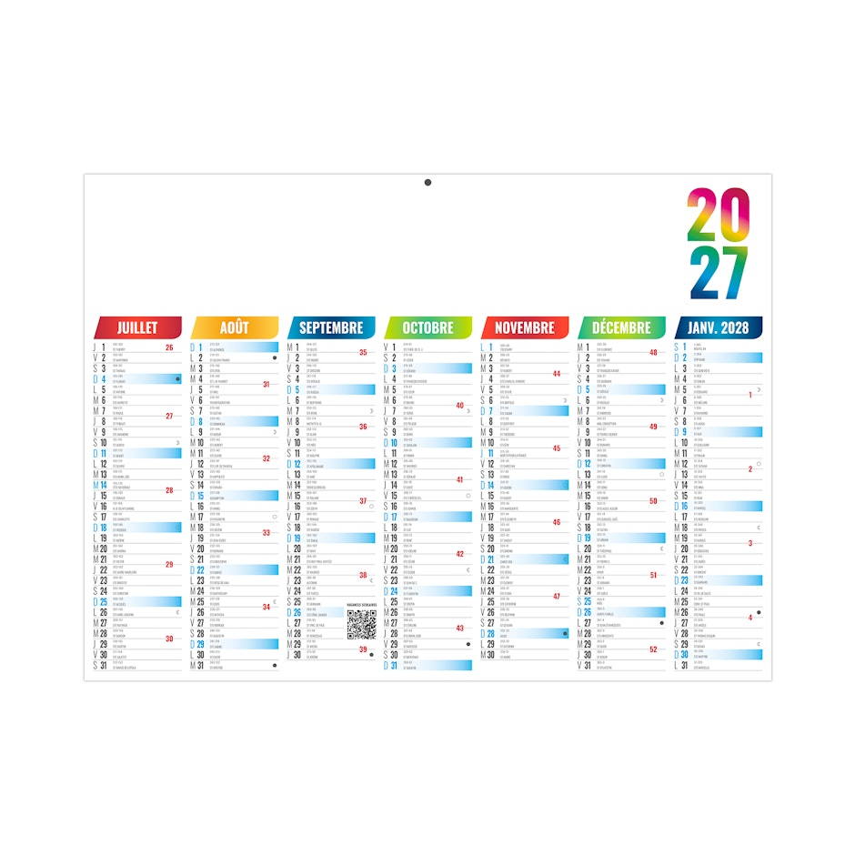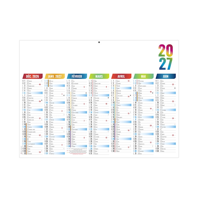7 mois par face. La grille comprend les Saints, n° de semaines, phases lunaires, congés scolaires et le compte et décompte journalier.