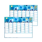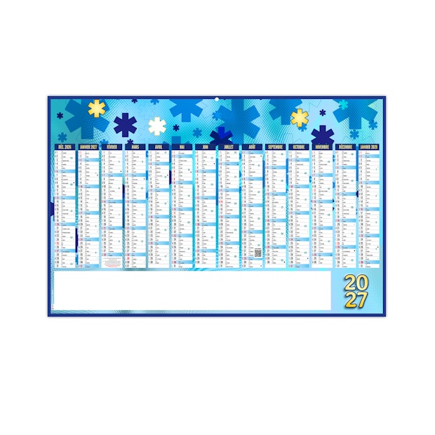 14 mois au recto. Au verso pour les MAXIS dos vierge ou 10 thèmes au choix répiquables : Numéros d'urgence / France routière / France régionale / France Europe / Monde politique / dos Vins / dos Epices / dos Corse / dos Écogestes / dos Eaux thermales.. Pour le format MÉDIUM uniquement dos vierge.