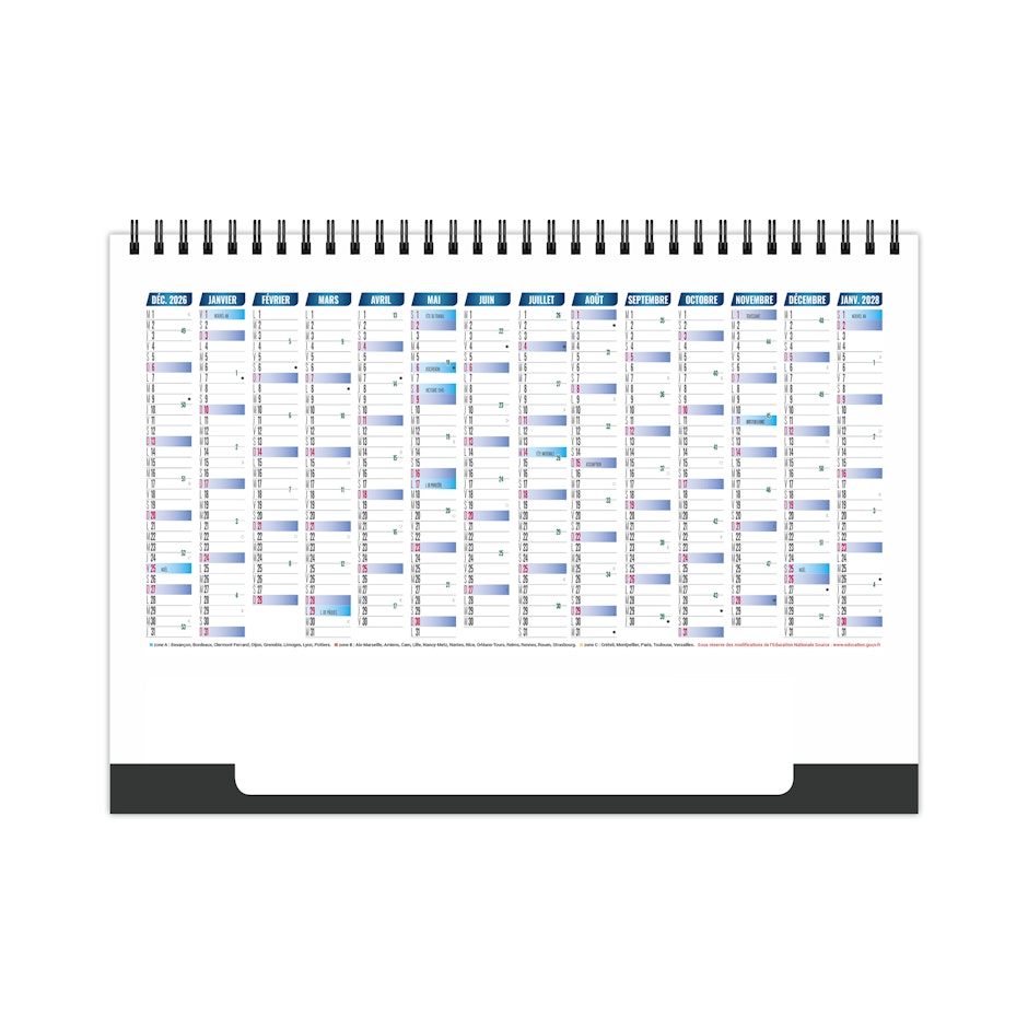 2 mois par feuillet. La grille comprend les numéros de semaines. Les congés scolaires sont sur le verso du 7ème feuillet.