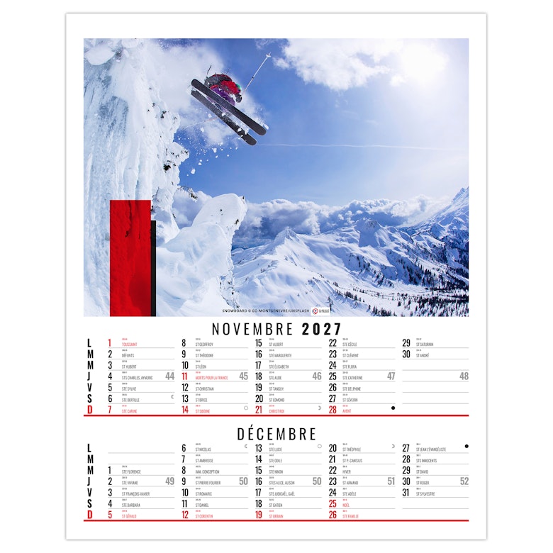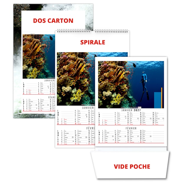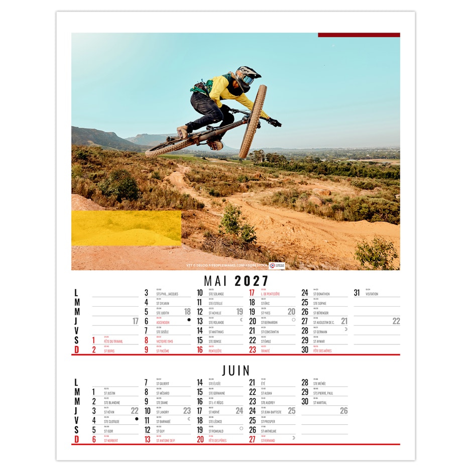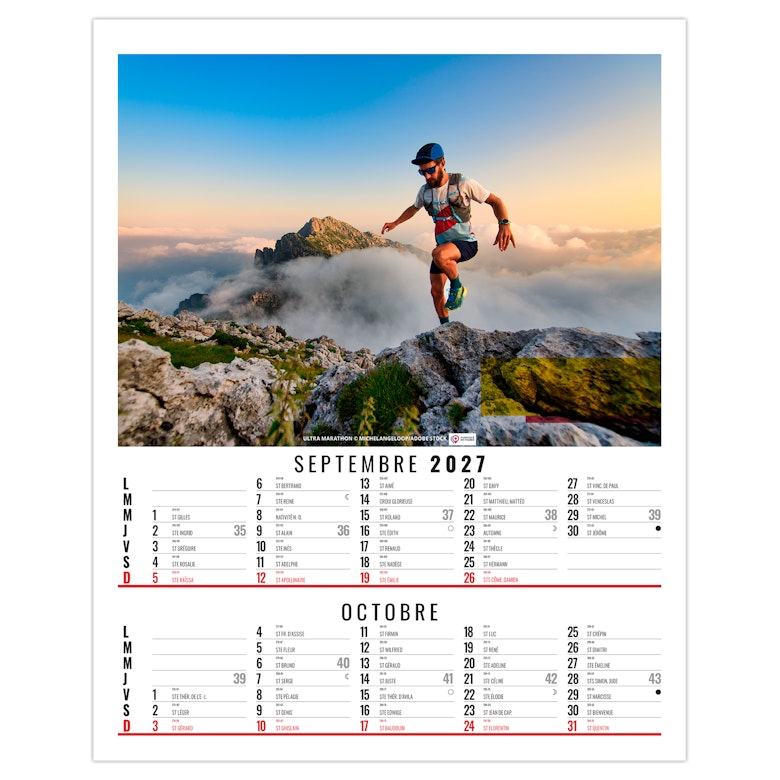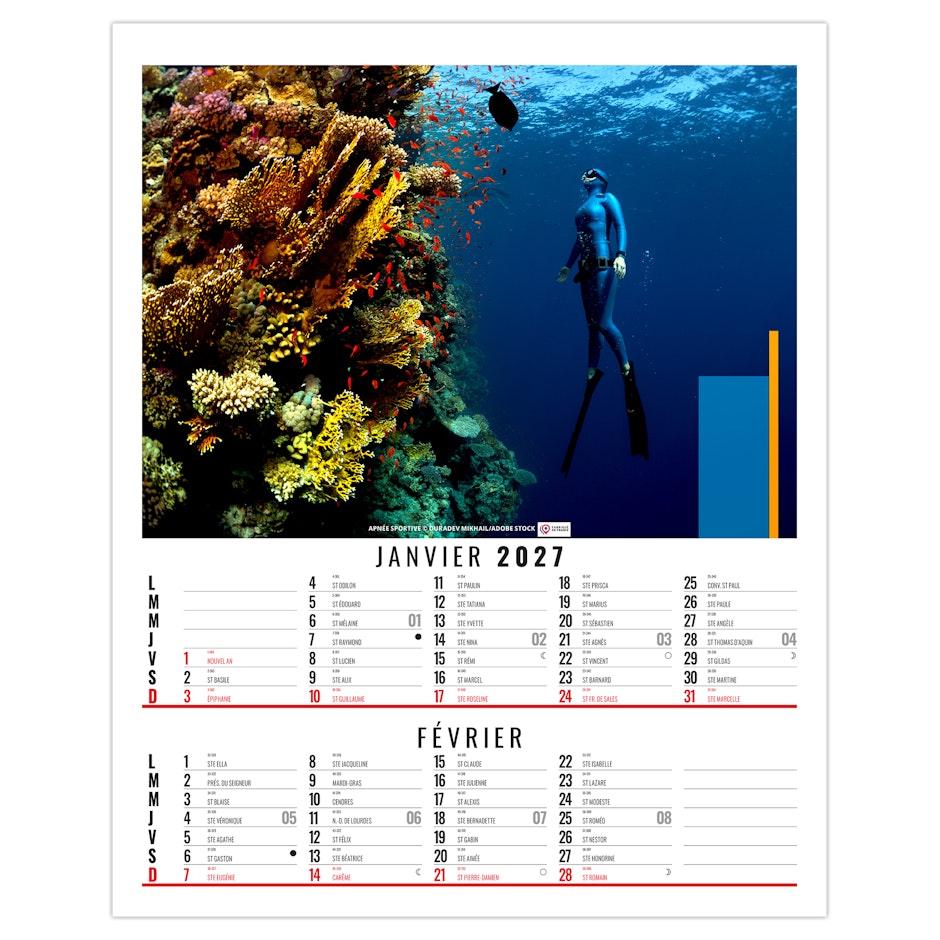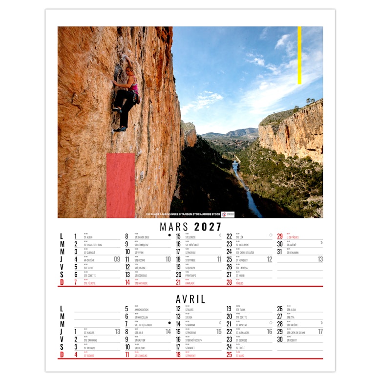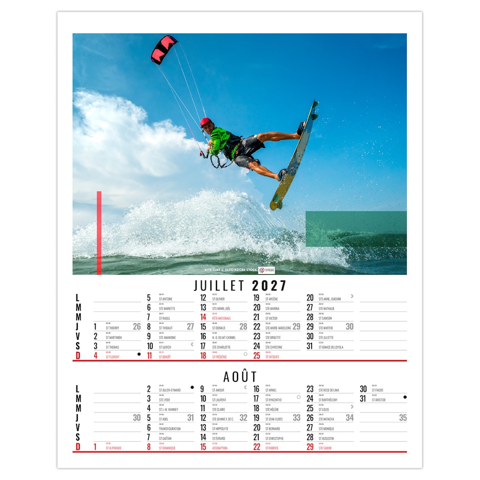 Calendrier illustré de 6 photos de sports extrêmes comme la plongée en apnée, l'escalade à mains nues sur roche, le kite surf, le Trail, le VTT de descente ou encore le ski hors piste. Nous vous en proposons quelques uns dans ce bloc illustré qui existe également en dos vide-poche et en calendrier spirale. Photographies Adobe stock.