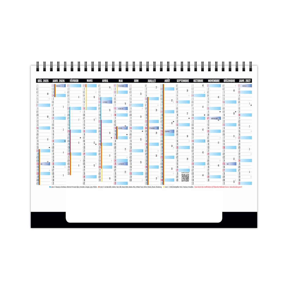 2 mois par feuillet. La grille comprend les numéros de semaines. Les congés scolaires sont sur le verso du 7ème feuillet.