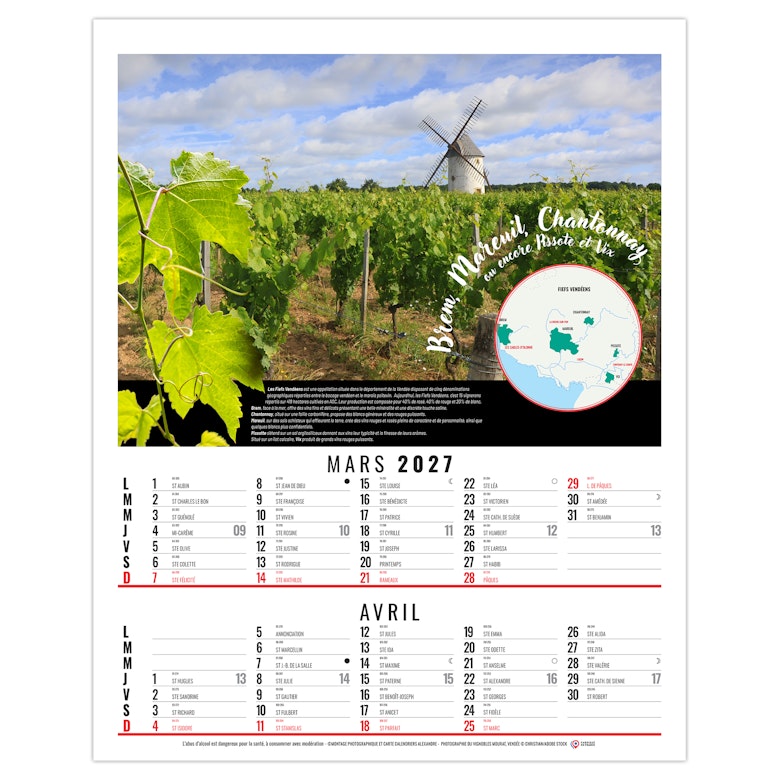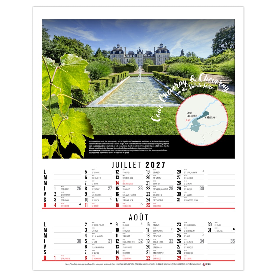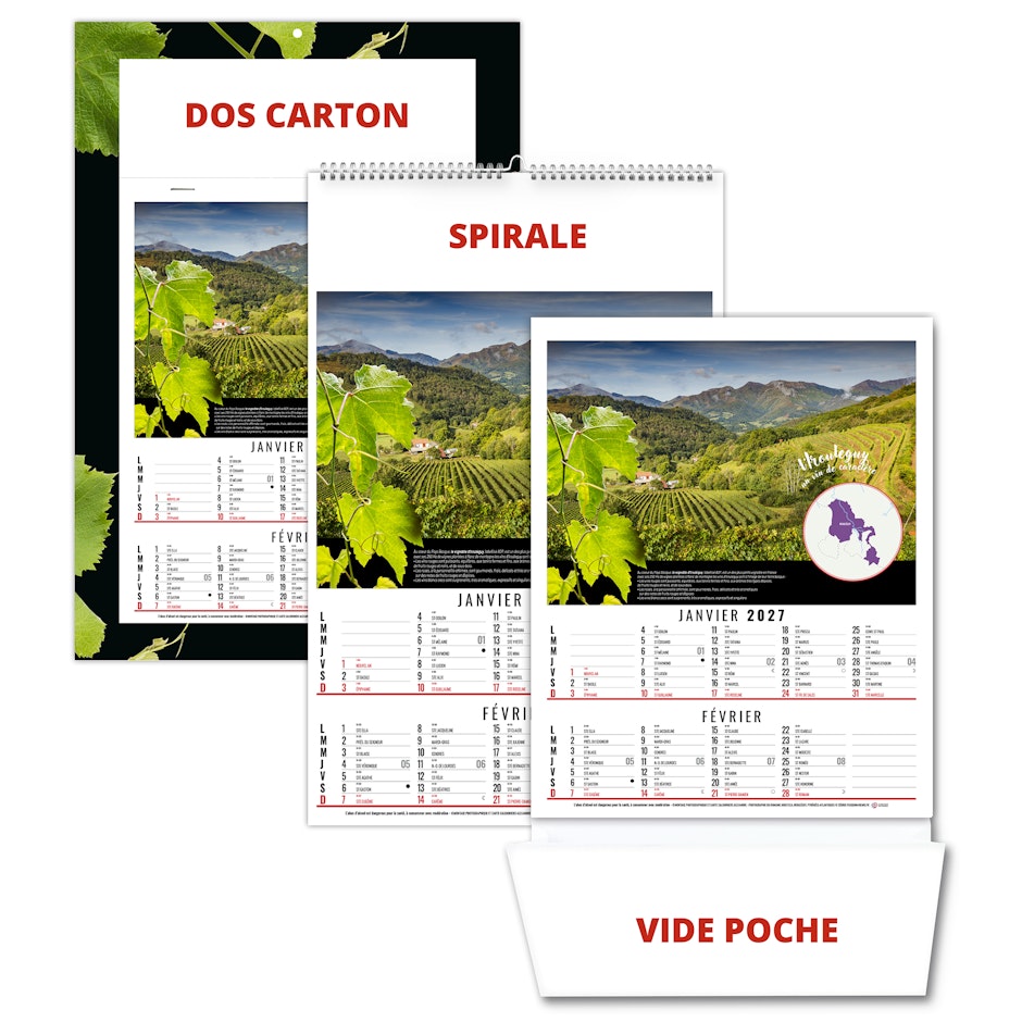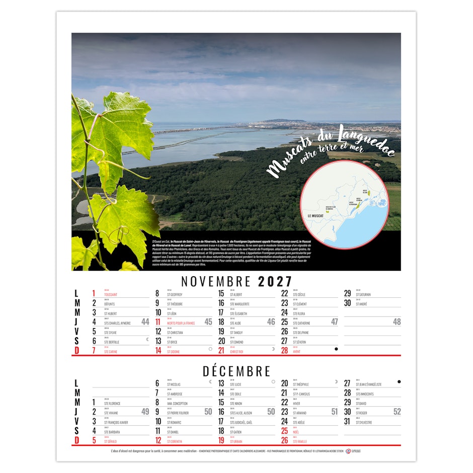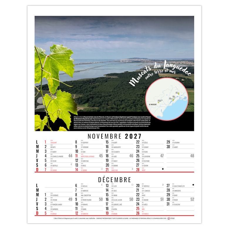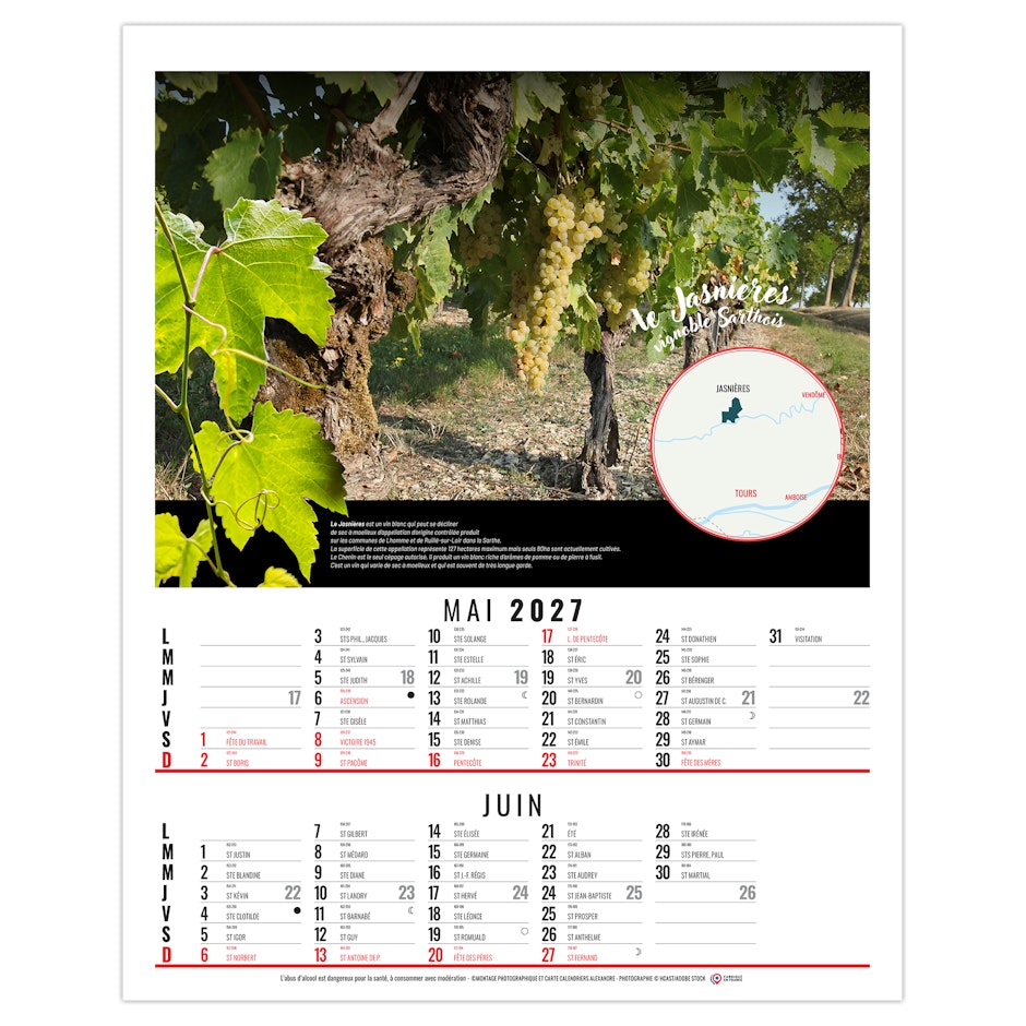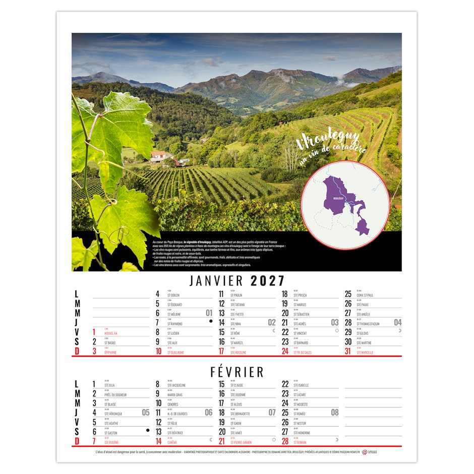 Calendrier illustré sur le thème du vin, les toutes petites appellations en particulier, comme le Jasnières, les vins du fief Vendéens ou du Forez, sans oubliez l'Iroulléguy et les Muscats de Frontignan. Photographies Hemis.fr - Adobe stock.