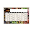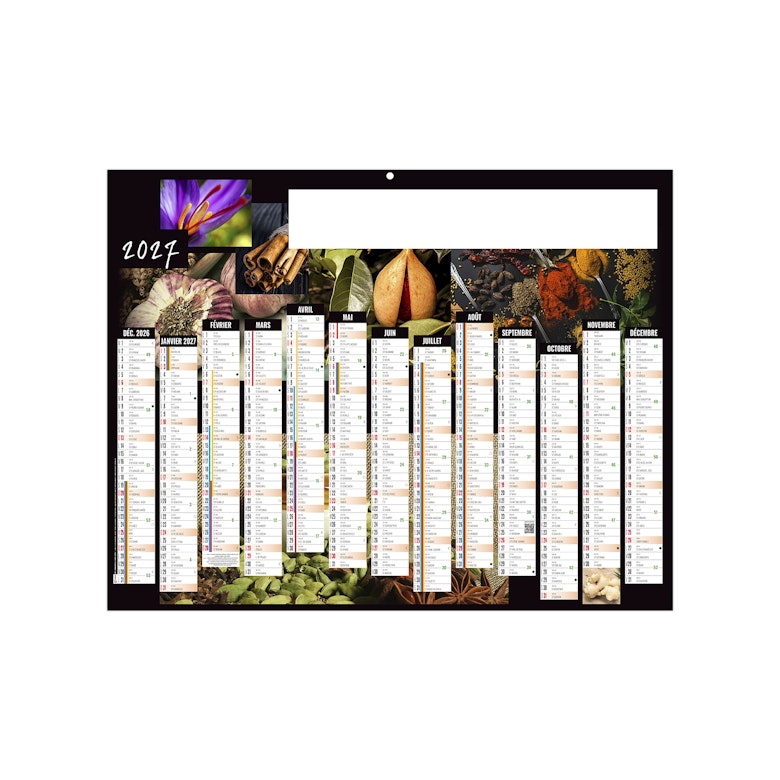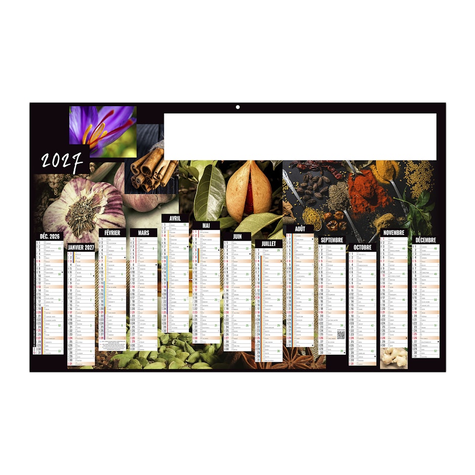 13 mois au recto. Au verso pour les MAXIS dos vierge ou 10 thèmes au choix répiquables : Numéros d'urgence / France routière / France régionale / France Europe / Monde politique / dos Vins / dos Epices / dos Corse / dos Écogestes / dos Eaux thermales. Pour le format MÉDIUM uniquement dos vierge.