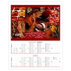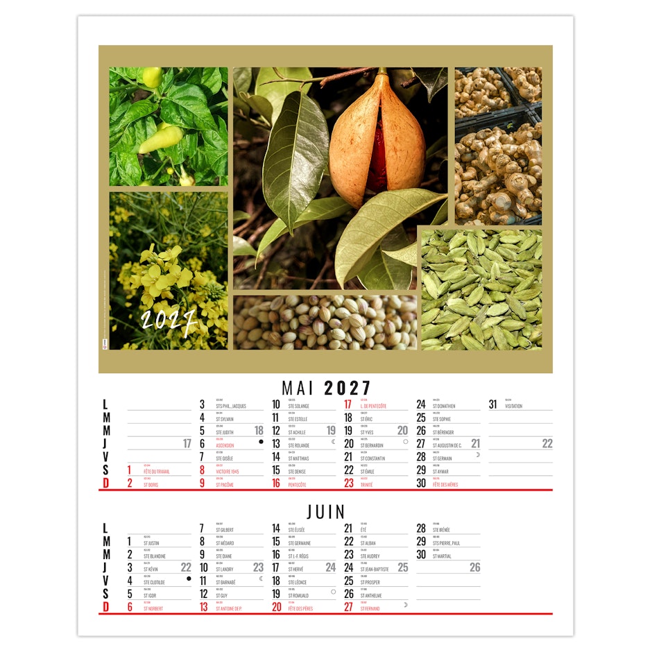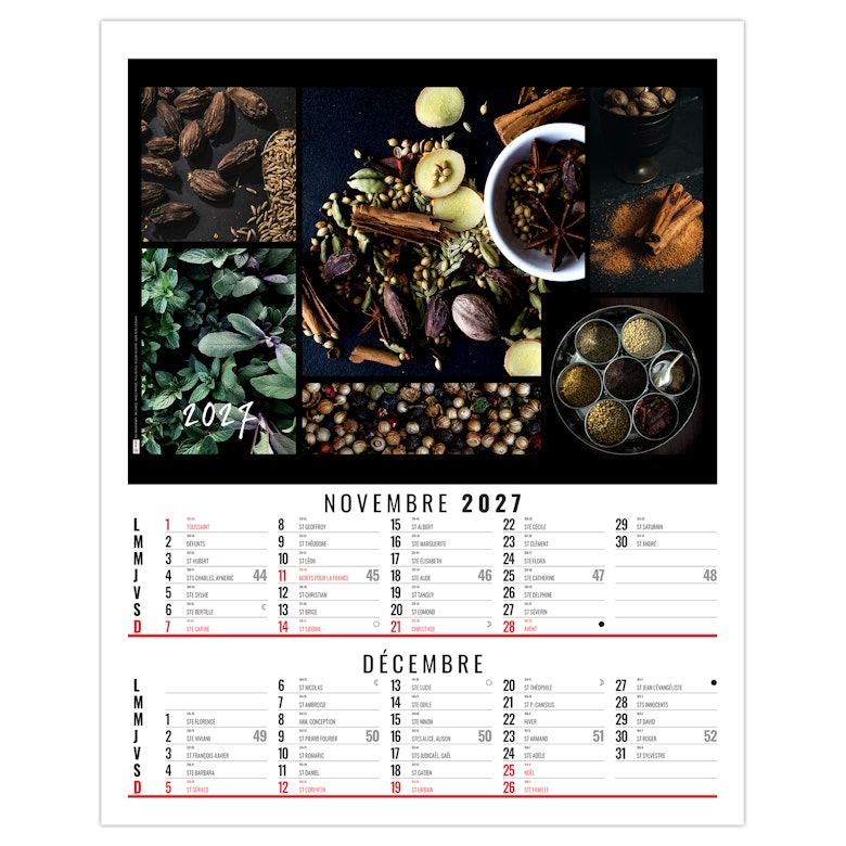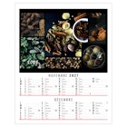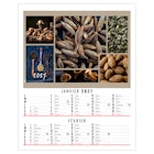 Calendrier illustré sur le thème des épices. Chaque page est composé d'une mosaïque de photos, offrant une diversité de couleurs. Photographies Unsplash.