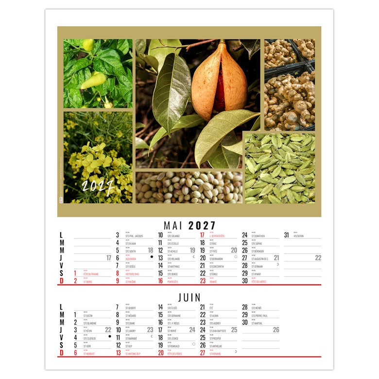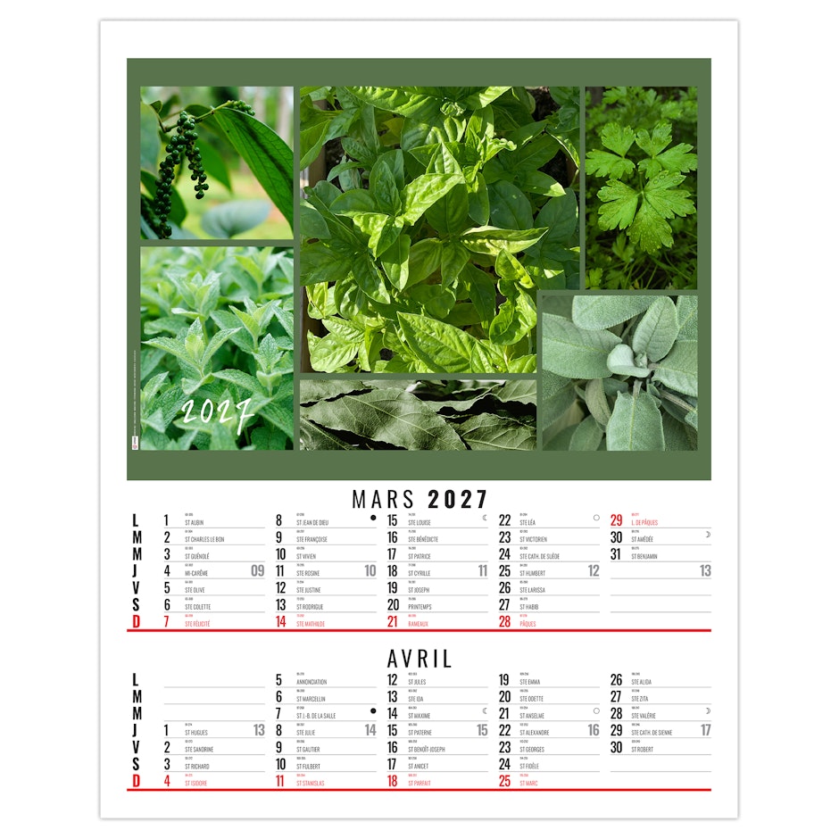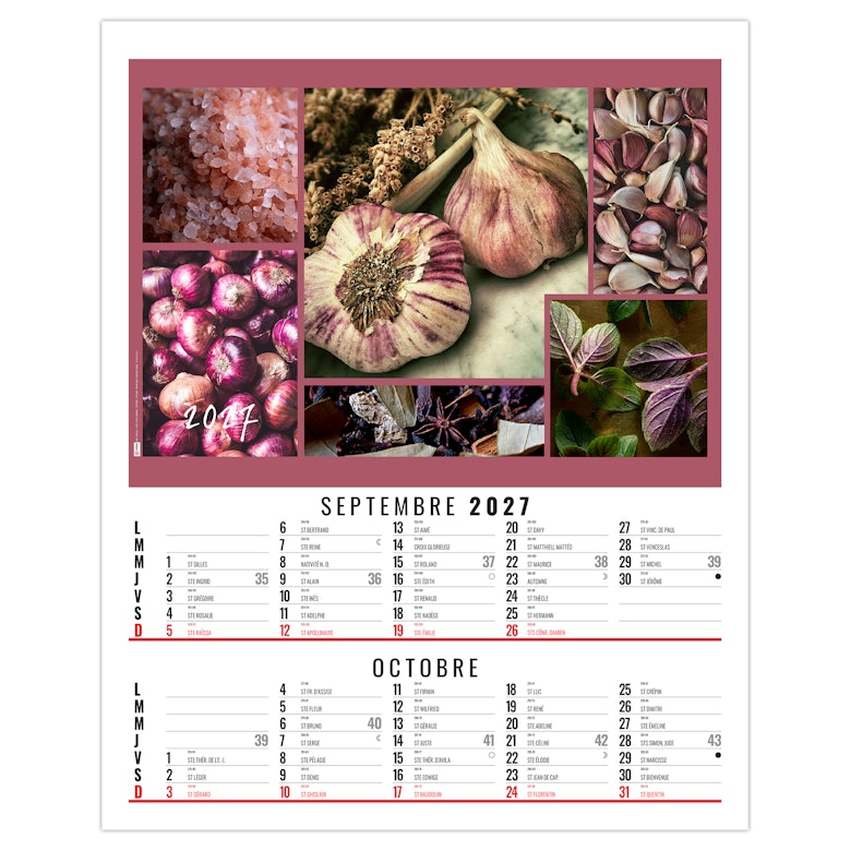 La grille calendaire est composée des Saints, numéros de semaines, phases lunaires, congés scolaires et le compte et décompte journalier. Plus grille 2028 sur dos carton.
