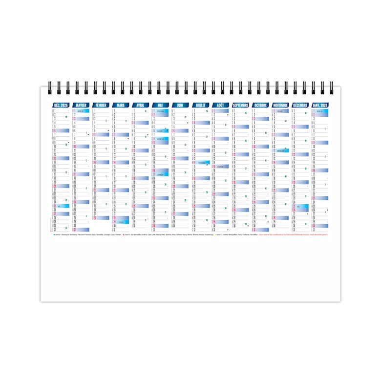 1 mois par feuillet. La grille calendaire comprend les saints, compte et décompte journalier, lunes et les numéros de semaines. Les congés scolaires sont sur le verso du 13ème feuillet.