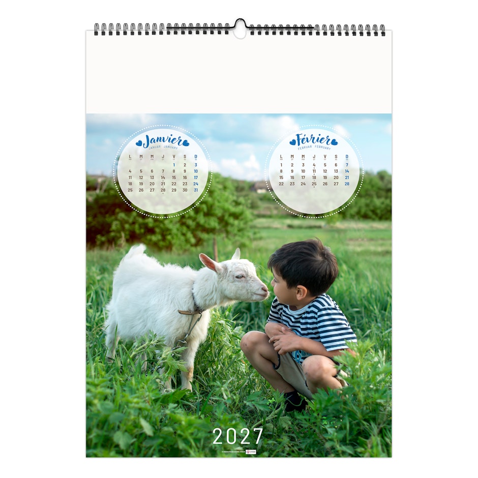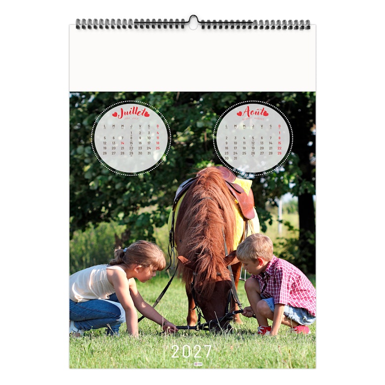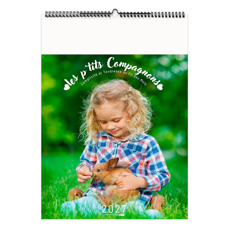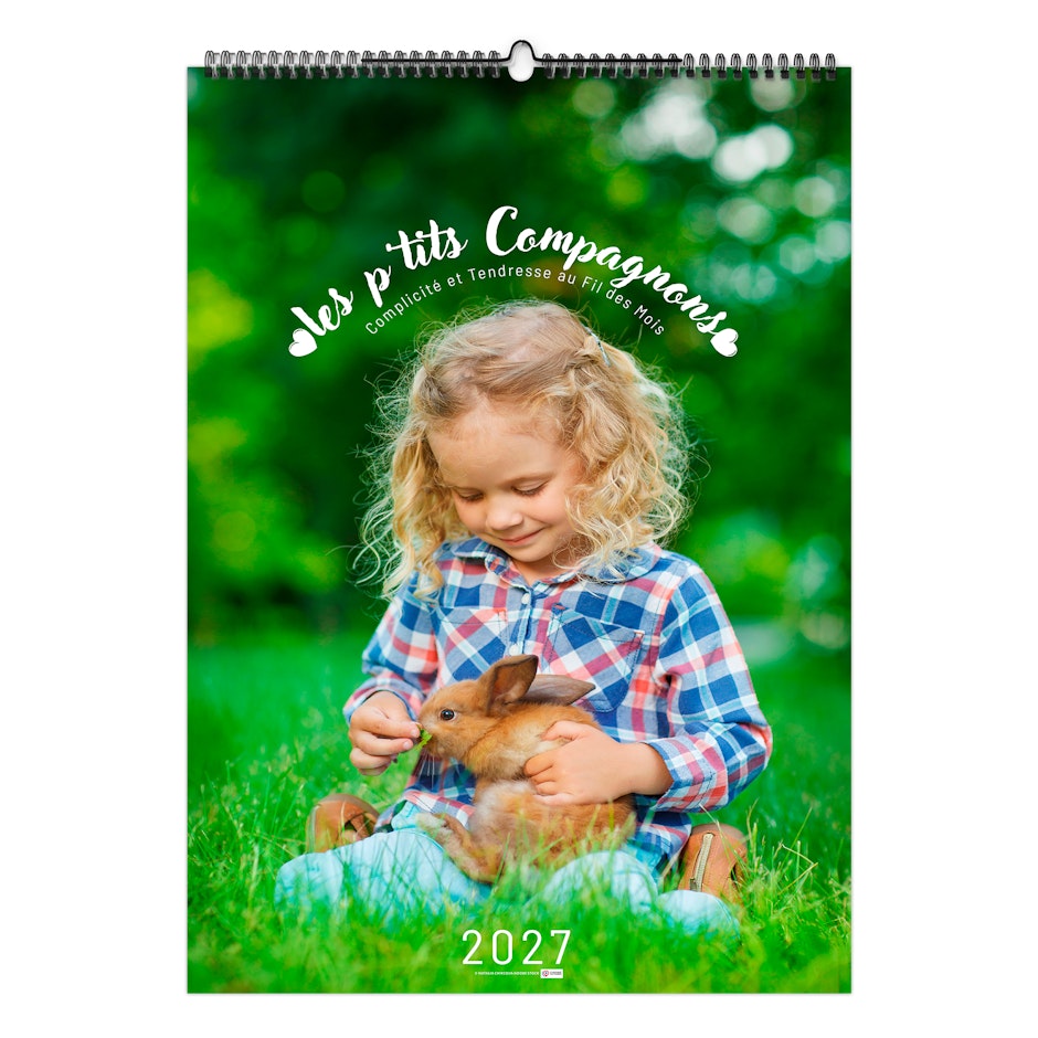 Calendrier 2027 illustré 6 ou 7 feuillets sur le thème des enfants et leur animal de compagnie.