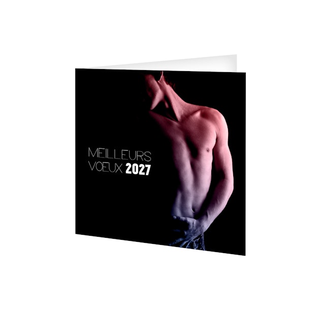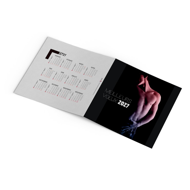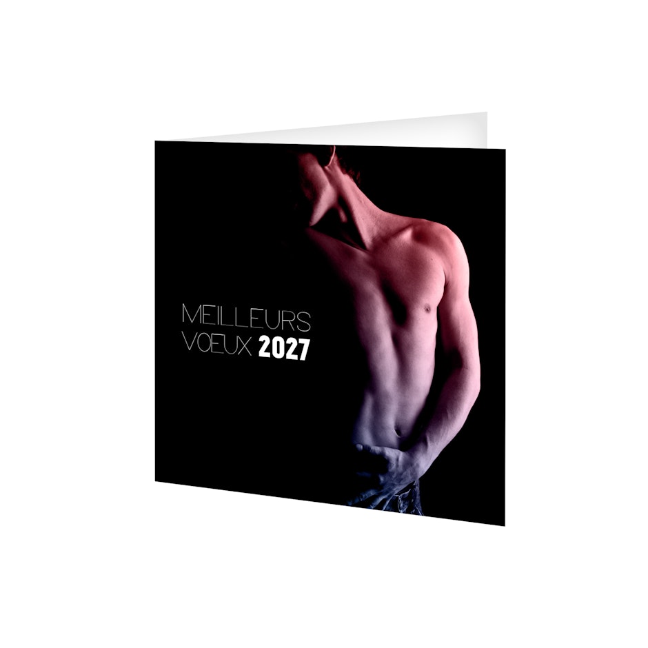 Découvrez notre carte de voeux publicitaire avec calendrier 2027. Souhaitez vos meilleurs voeux à tout votre entourage avec cette carte illustrée sur le thème masculin du nu. Photographie Adobe Stock.