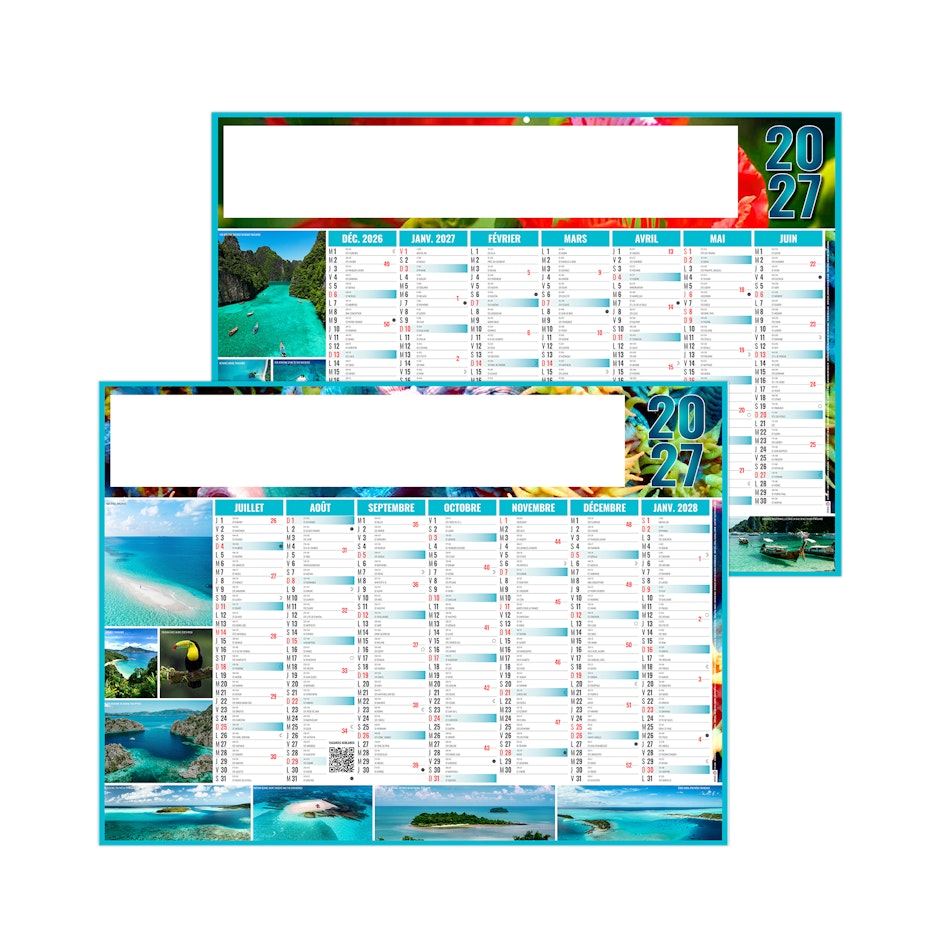 Calendrier illustré de photos d'îles paradisiaques, que vous pouvez personnaliser avec vos propres photos à partir de 100 ex. Unsplash.