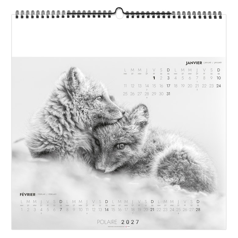 2 mois par page. La grille comprend les jours et mois en 3 langues (Français, Anglais, Allemand), les n° de semaines et jours fériés.