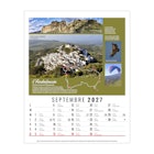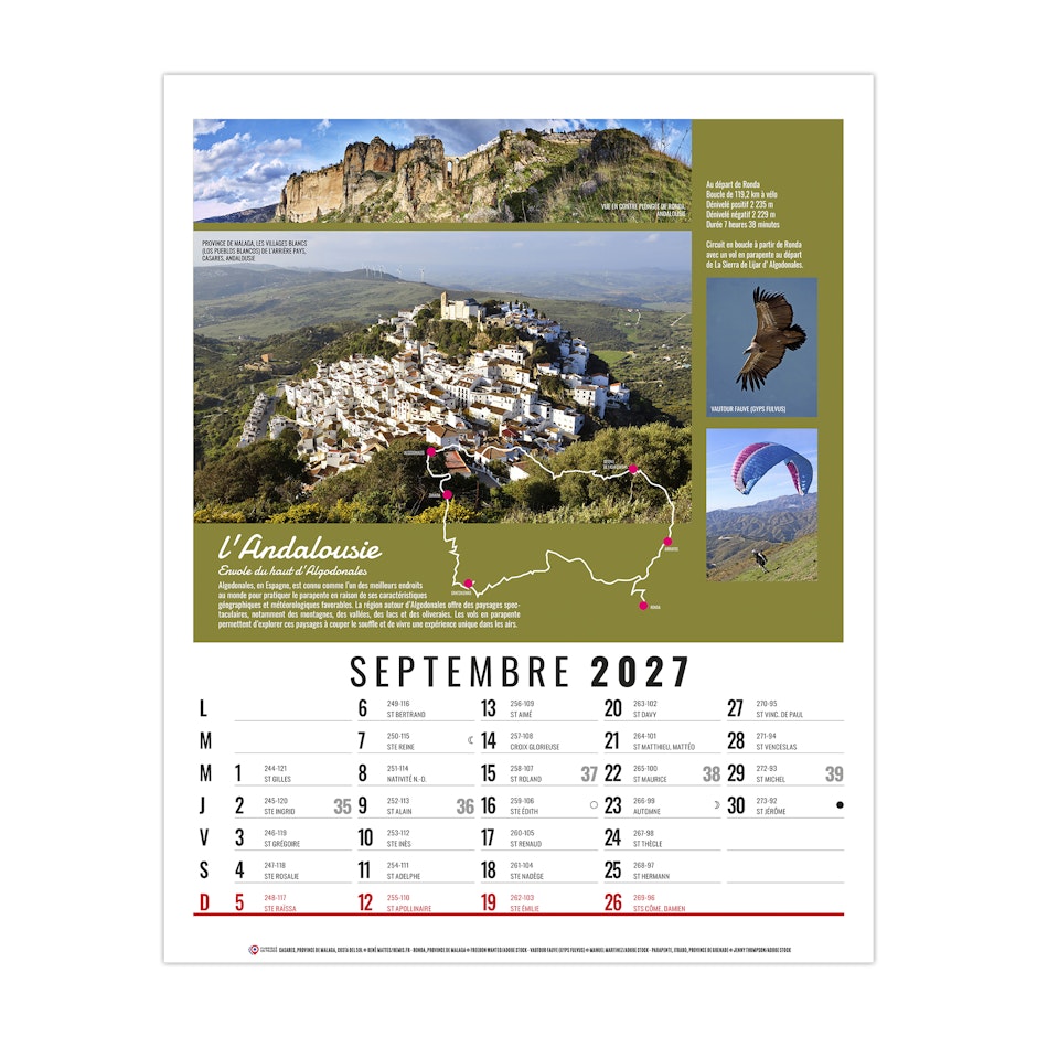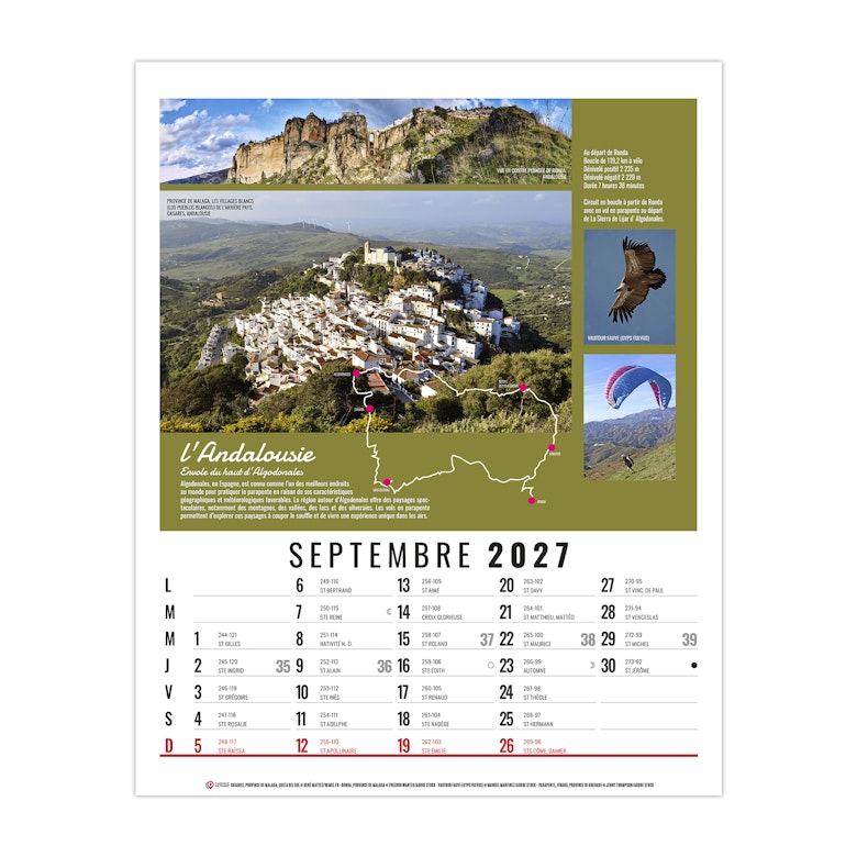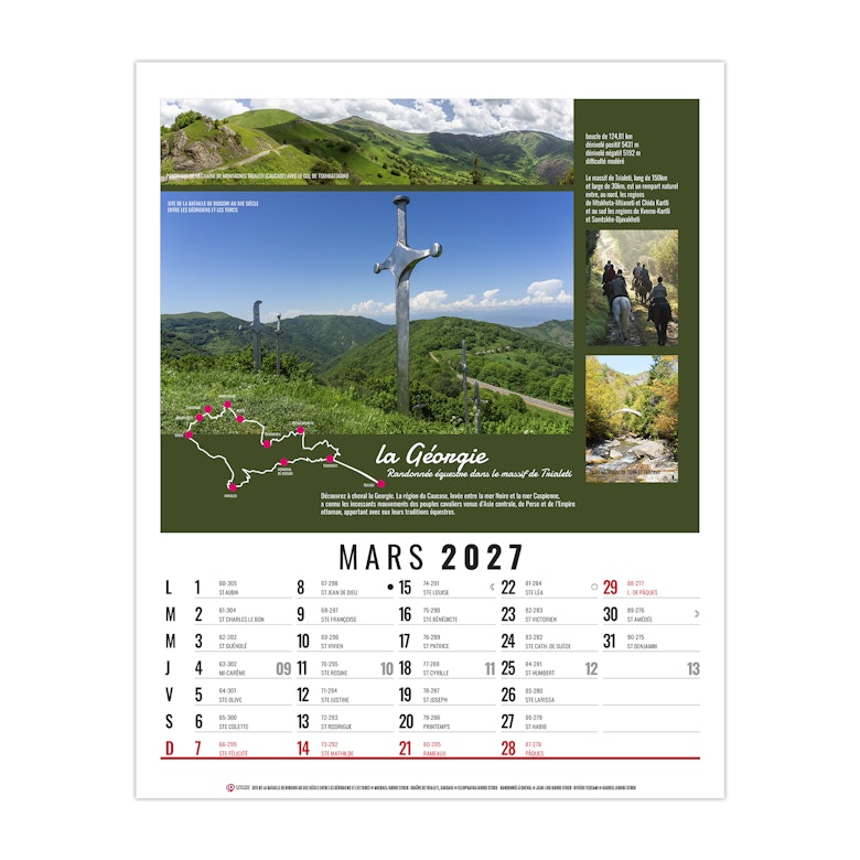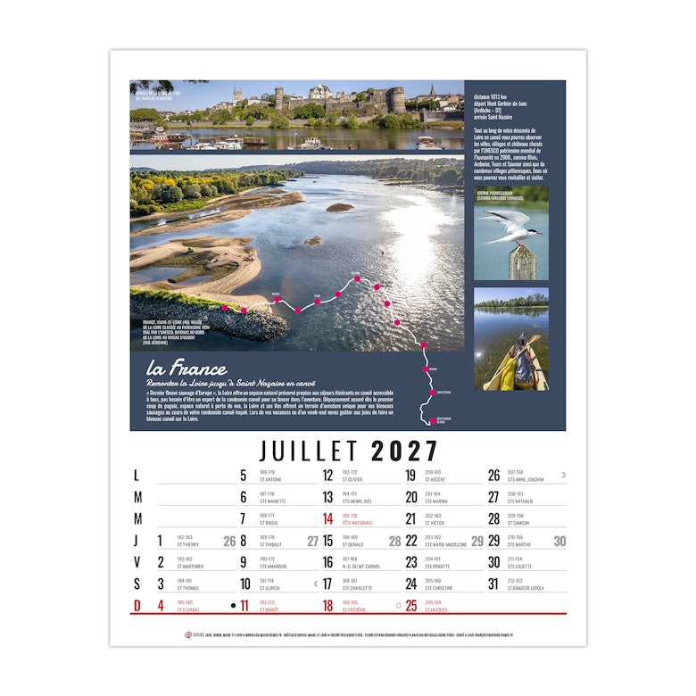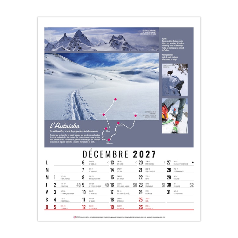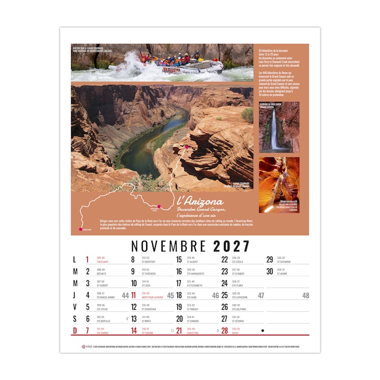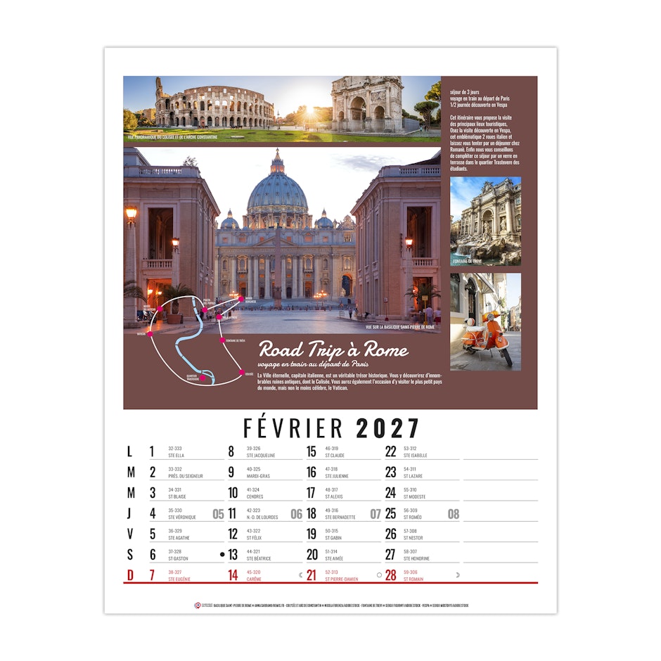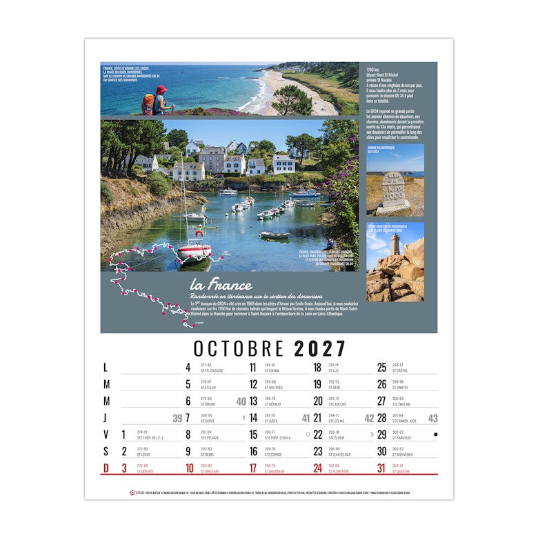 La grille calendaire est composée des Saints, numéros de semaines, phases lunaires, congés scolaires et le compte et décompte journalier. Plus grille 2028 sur dos carton.