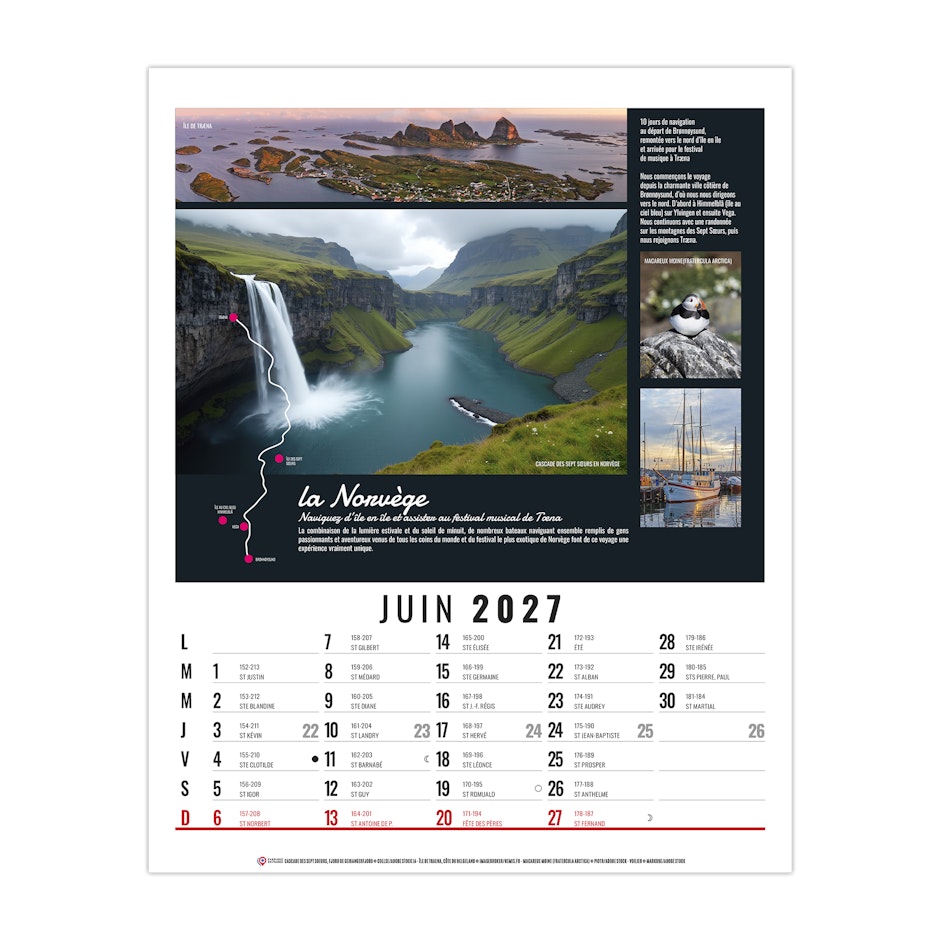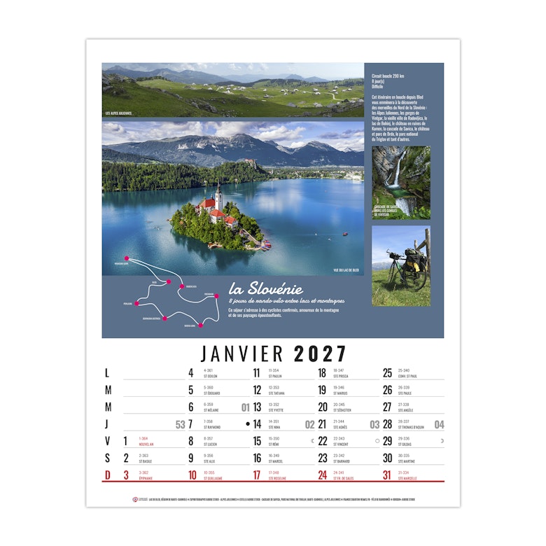 Calendrier illustré de 12 mosaïques de photos sur le slow voyage. Aujourd'hui bon nombre de voyageurs cherchent à décarboner leur voyage en partant à vélo, à pied, en train, à cheval ou en bateau. Photographies Adobestock - Hemis.