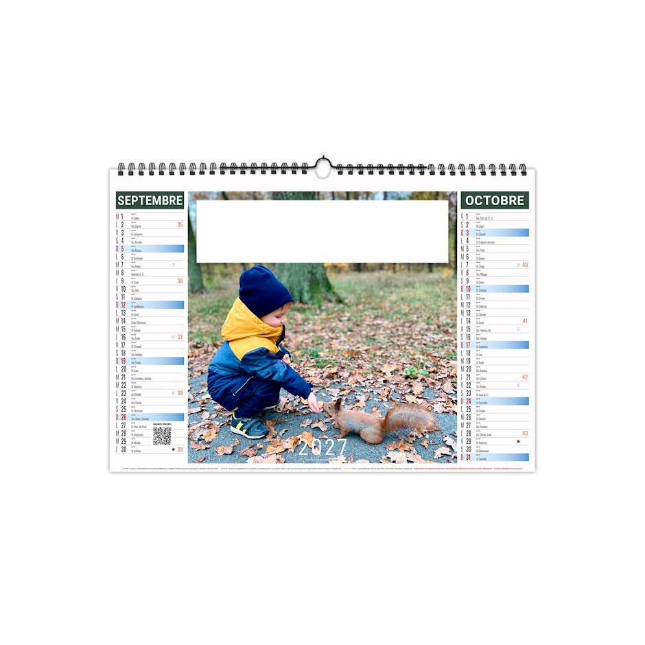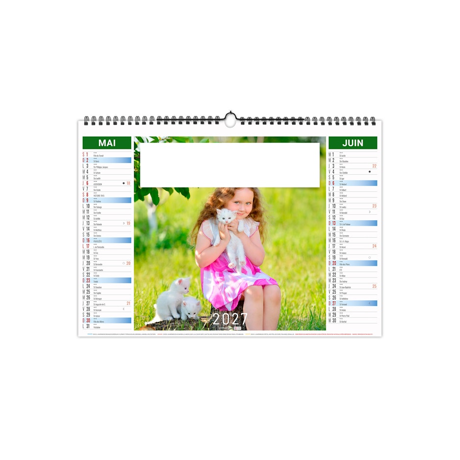 2 mois par page. La grille comprend les jours, les mois, les numéros de semaines et les jours fériés.