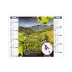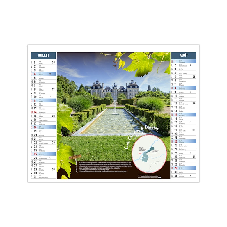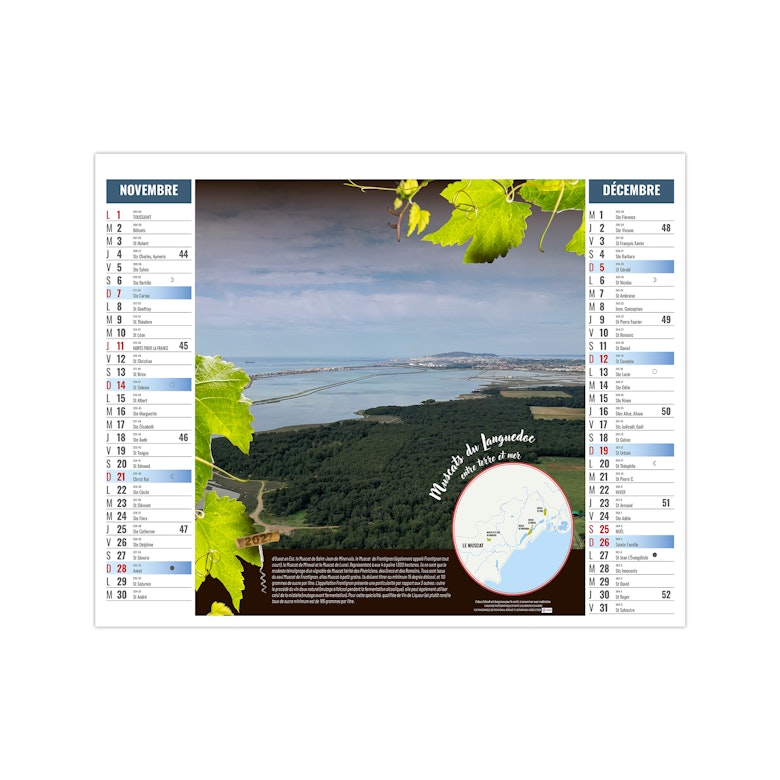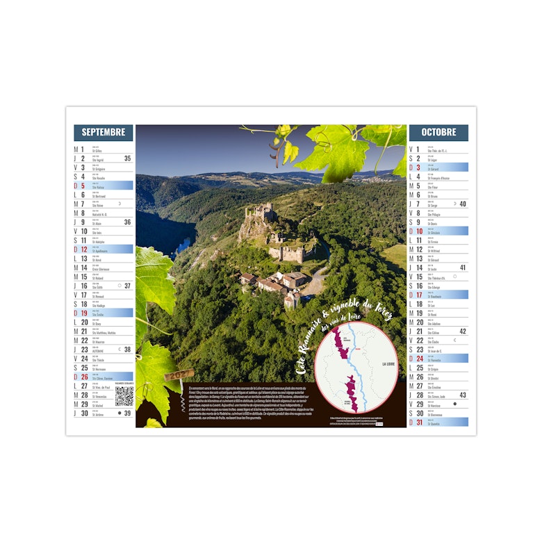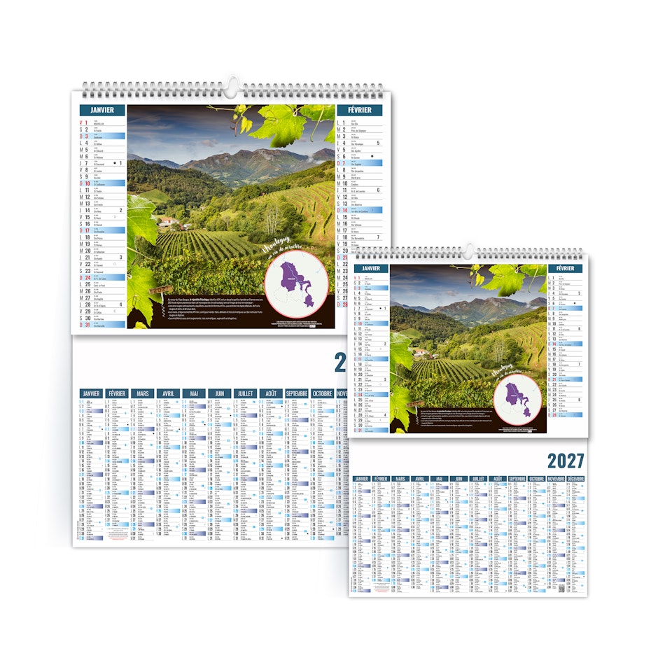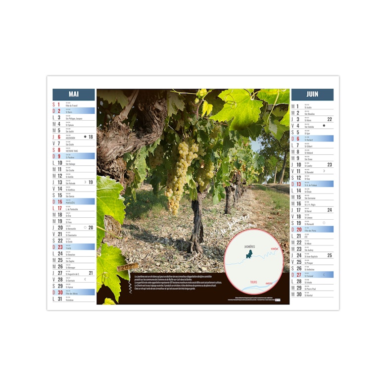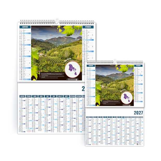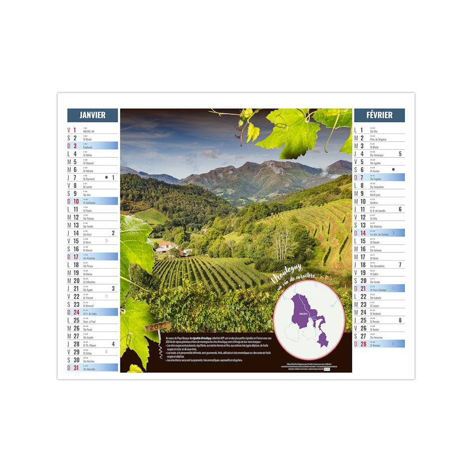 Ce calendrier bancaire est illustré dans sa partie haute sur le thème des petites appellations de France. Y figure ainsi l'Iroulléguy, le Cheverny, le fief Vendéen, le Jasnières, les vins du Forez et les muscats du Languedoc. Photographies Adobe stock - Hémis.