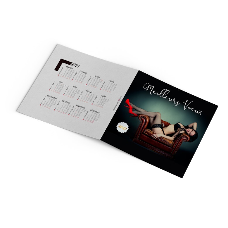 Découvrez notre carte de voeux publicitaire avec calendrier 2027. Souhaitez vos meilleurs voeux à tout votre entourage avec cette carte illustrée d'une femme lassive légèrement vêtue. Photographie Adobestock.