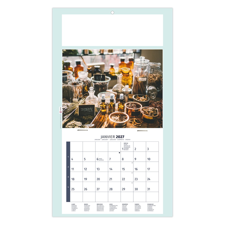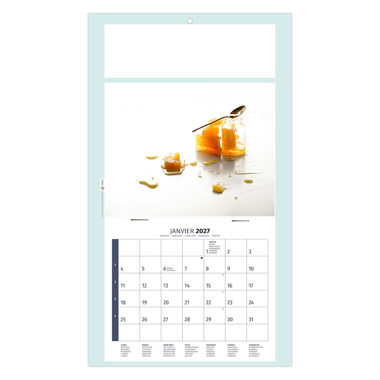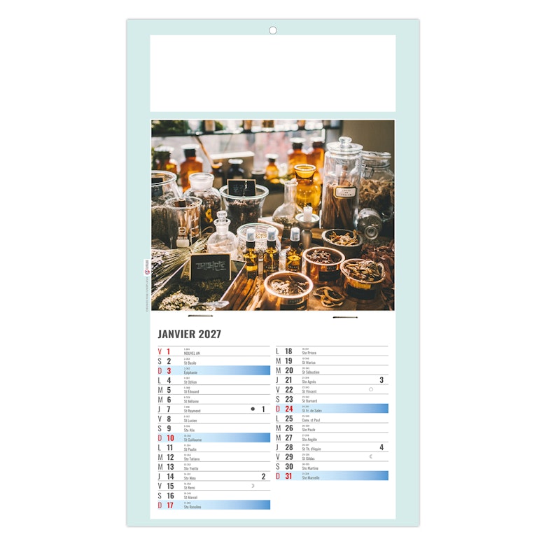 Au choix : Euro Bloc avec les fêtes nationales en 6 langues (D -GB - NL - L - I - E) ou Bloc éphéméride B2, mensuel 12 feuillets agrafés sur dos carton avec grille 2028 en fond. 1 mois par page. La grille est composée des Saints, numéros de semaines, congés scolaires, phases lunaires, compte et décompte journalier.