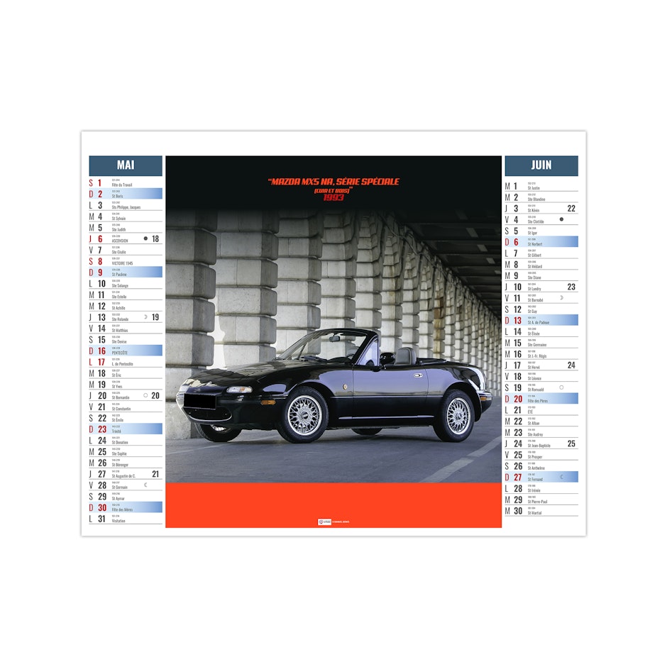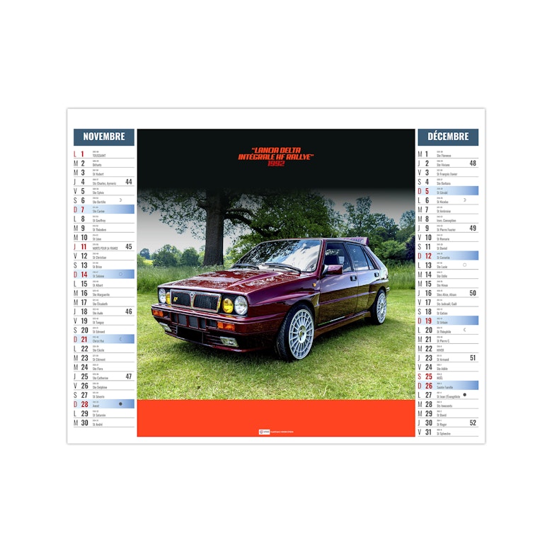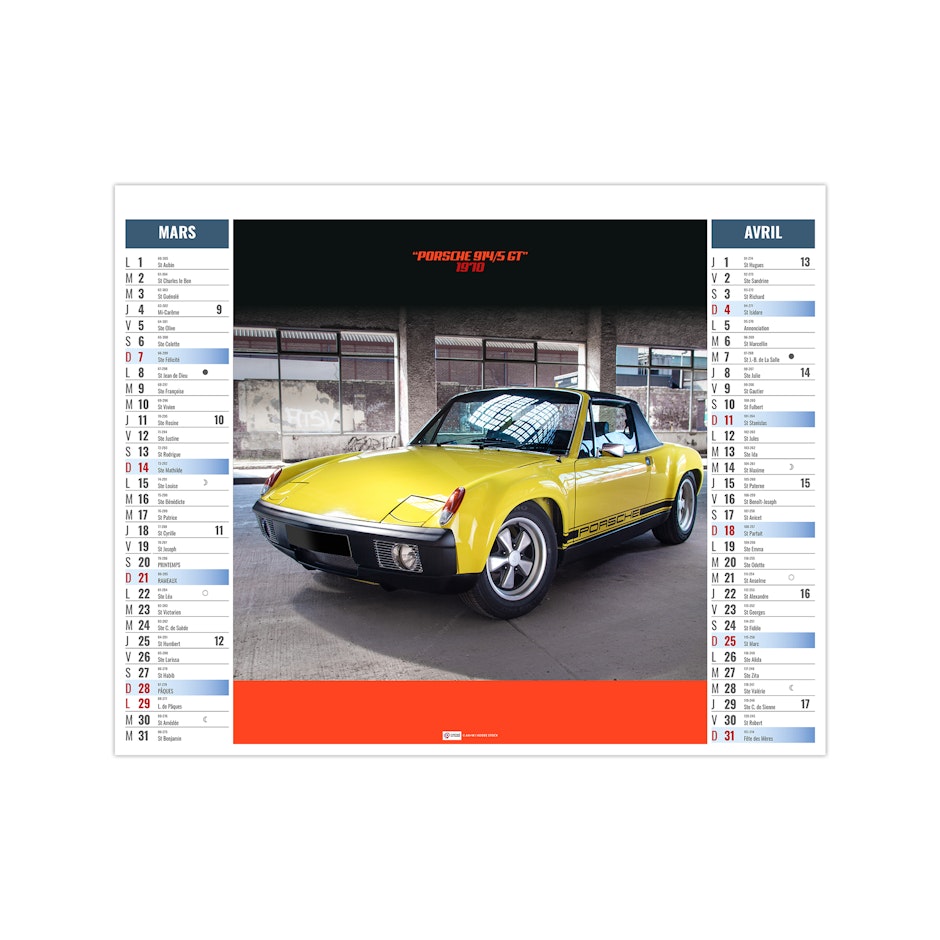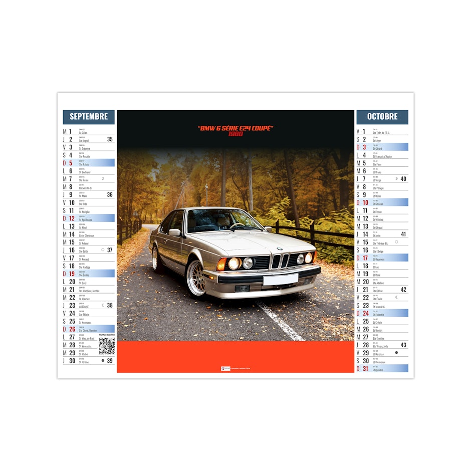 Ce calendrier bancaire est illustré dans sa partie haute de voitures des années 60 à 76. ce calendrier est idéal pour une communication murale annuelle de votre client, puisqu'il est à la fois illustré et bancaire. Pratique, ce calendrier se plie pour la mise sous pli. Montez à bord d'une Super Cinq GT, d'une Peugeot 205 GTI, d'une Mazda NX5 Na ou encore d'une Porsche 914/5 GT, à moins que vous ne préfèreriez rouler en BMW 6 série E24 coupée ou encore d'une Lancia delta intégrale et laissez-vous rêver. Photos Adobe stock - Daniel Denis.