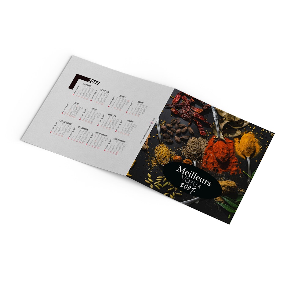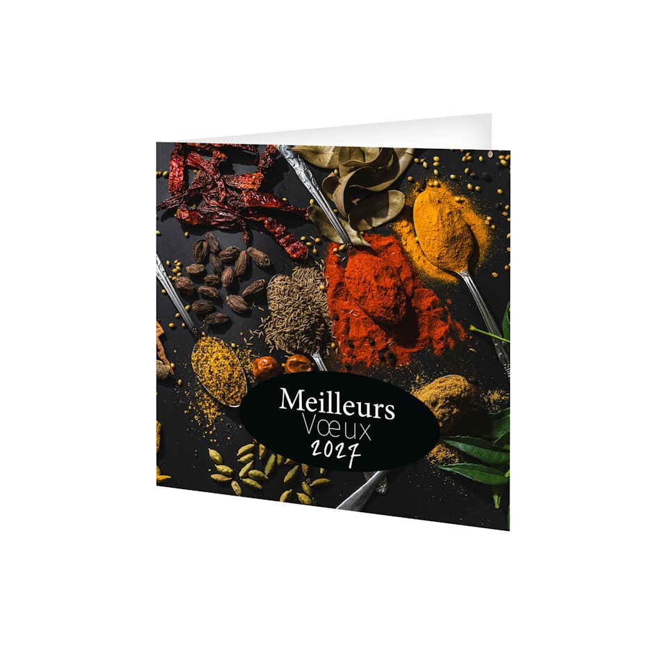 Découvrez notre carte de voeux publicitaire avec calendrier 2027. Souhaitez vos meilleurs voeux à tout votre entourage avec cette carte illustrée sur le thème des épices et condiments pour une nouvelle année haute en saveurs. Photographie Unsplash.