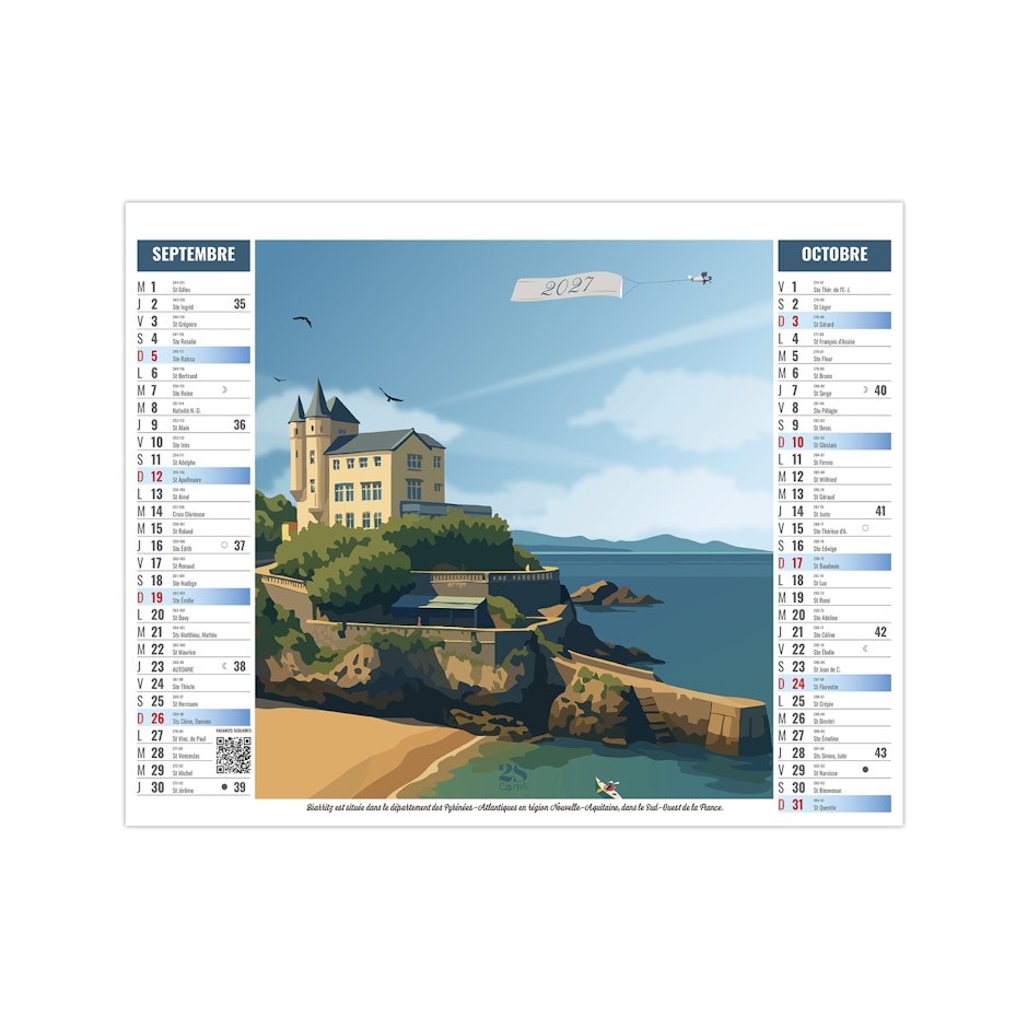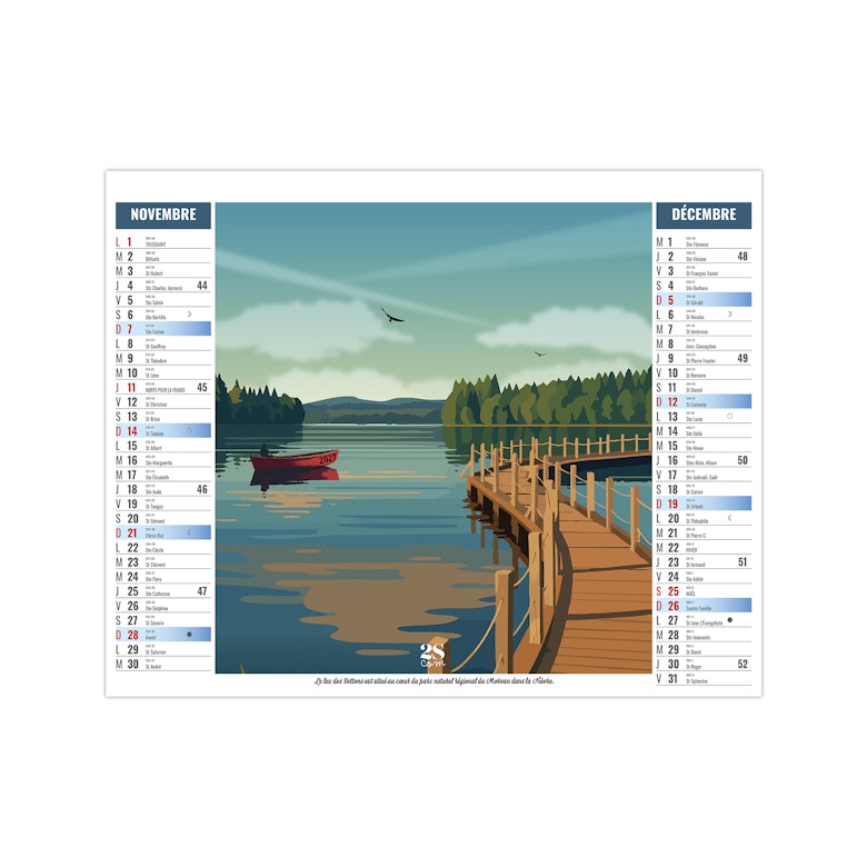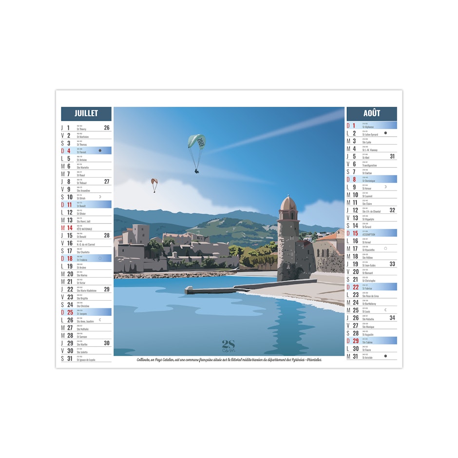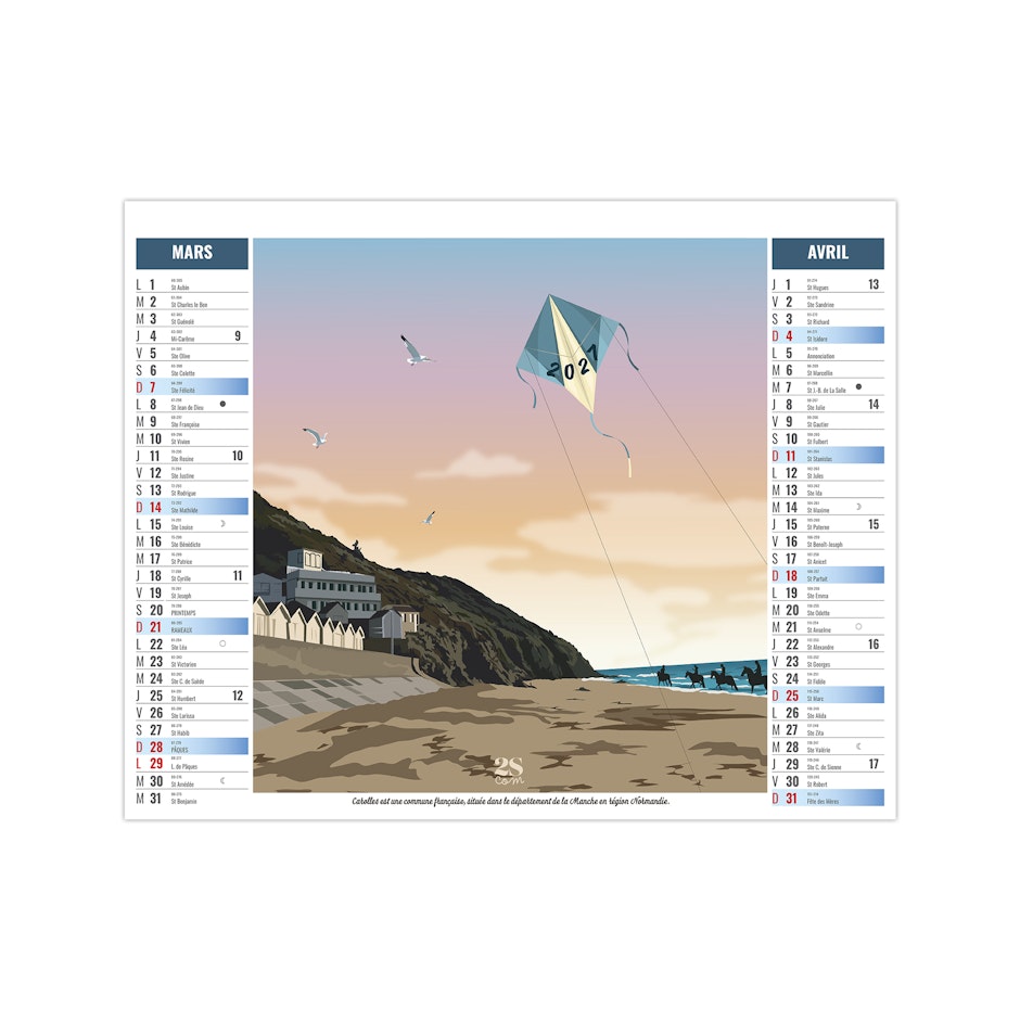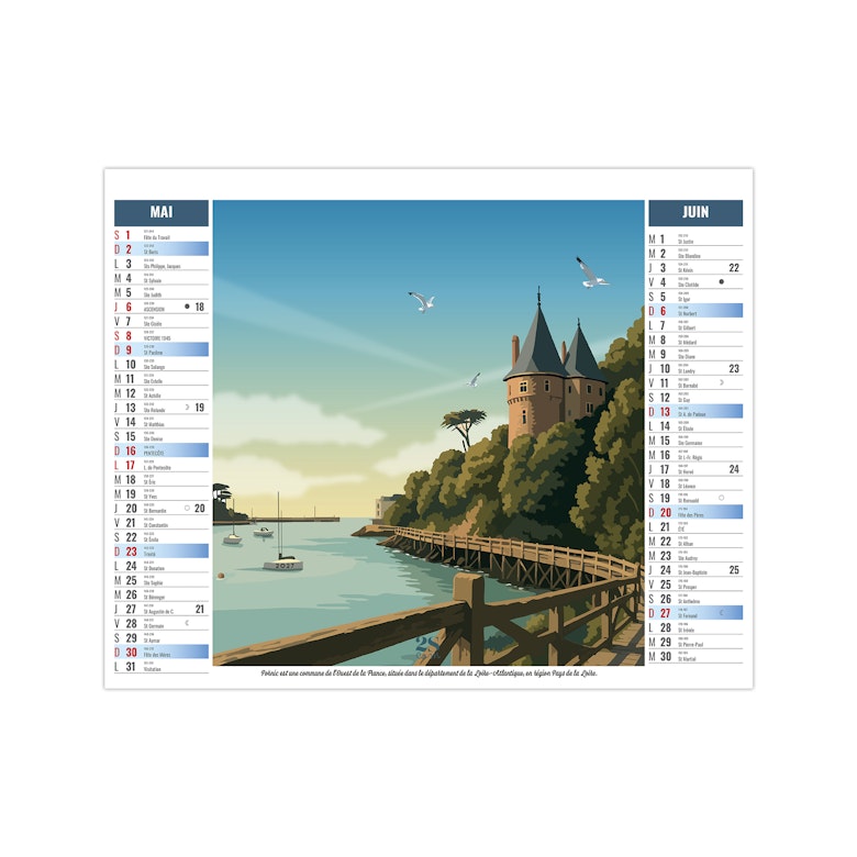 Ce calendrier bancaire est illustré dans sa partie haute d'illustrations numériques réalisées dans le style néo-rétro (vintages) sur le thème d'un road trip en france. En pied de calendrier, vous bénéficiez d'une lecture globale de l'année avec un calendrier bancaire 12 mois. Pratique, ce calendrier se replie pour la mise sous pli. Illustrations studio 2SCOM - Solène Suteau.