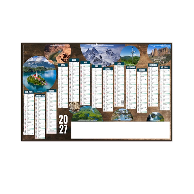 Calendrier 13 mois avec une grille calendaire comprend les Saints, n° de semaines, phases lunaires, congés scolaires et le compte et décompte journalier. Au verso pour les MAXIS dos vierge ou 10 thèmes au choix répiquables : Numéros d'urgence / France routière / France régionale / France Europe / Monde politique / dos Vins / dos Epices / dos Corse / dos Écogestes / dos Eaux thermales.