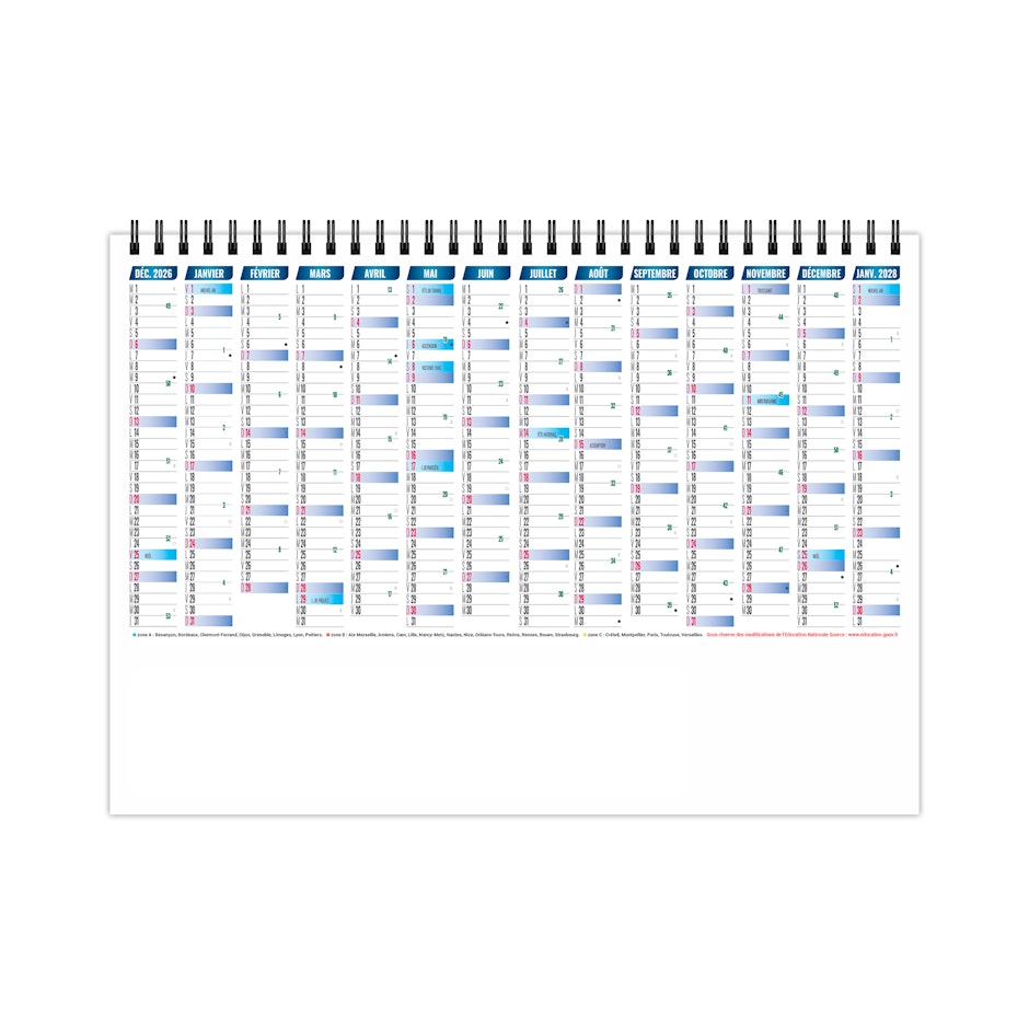 2 mois par feuillet. La grille comprend les numéros de semaines. Les congés scolaires sont sur le verso du 7ème feuillet.